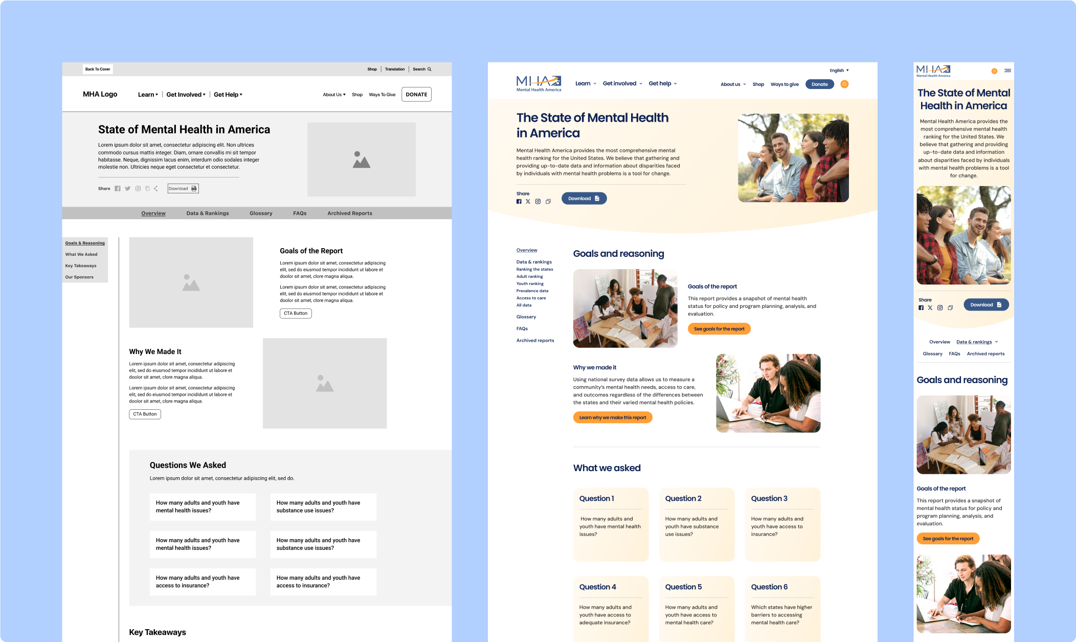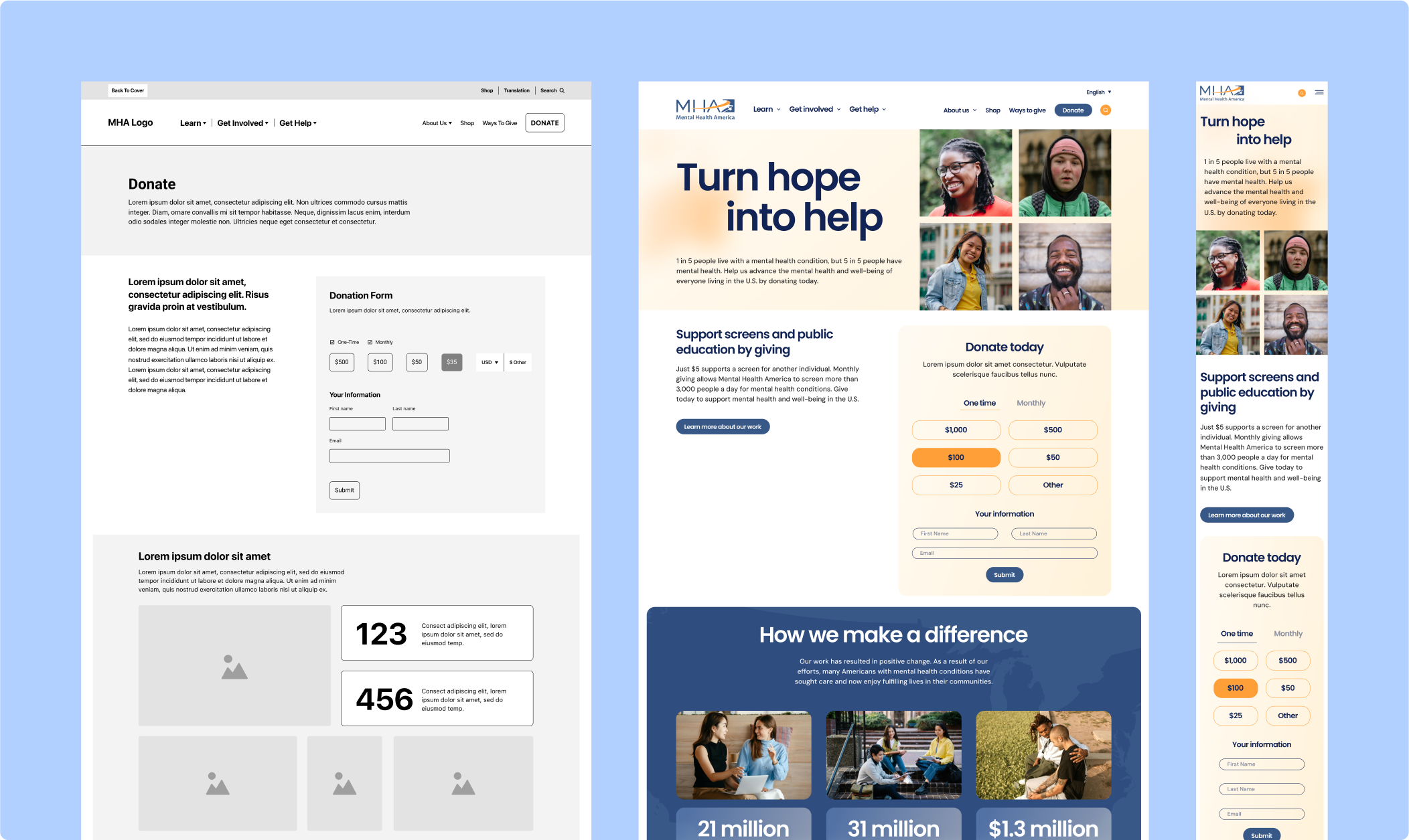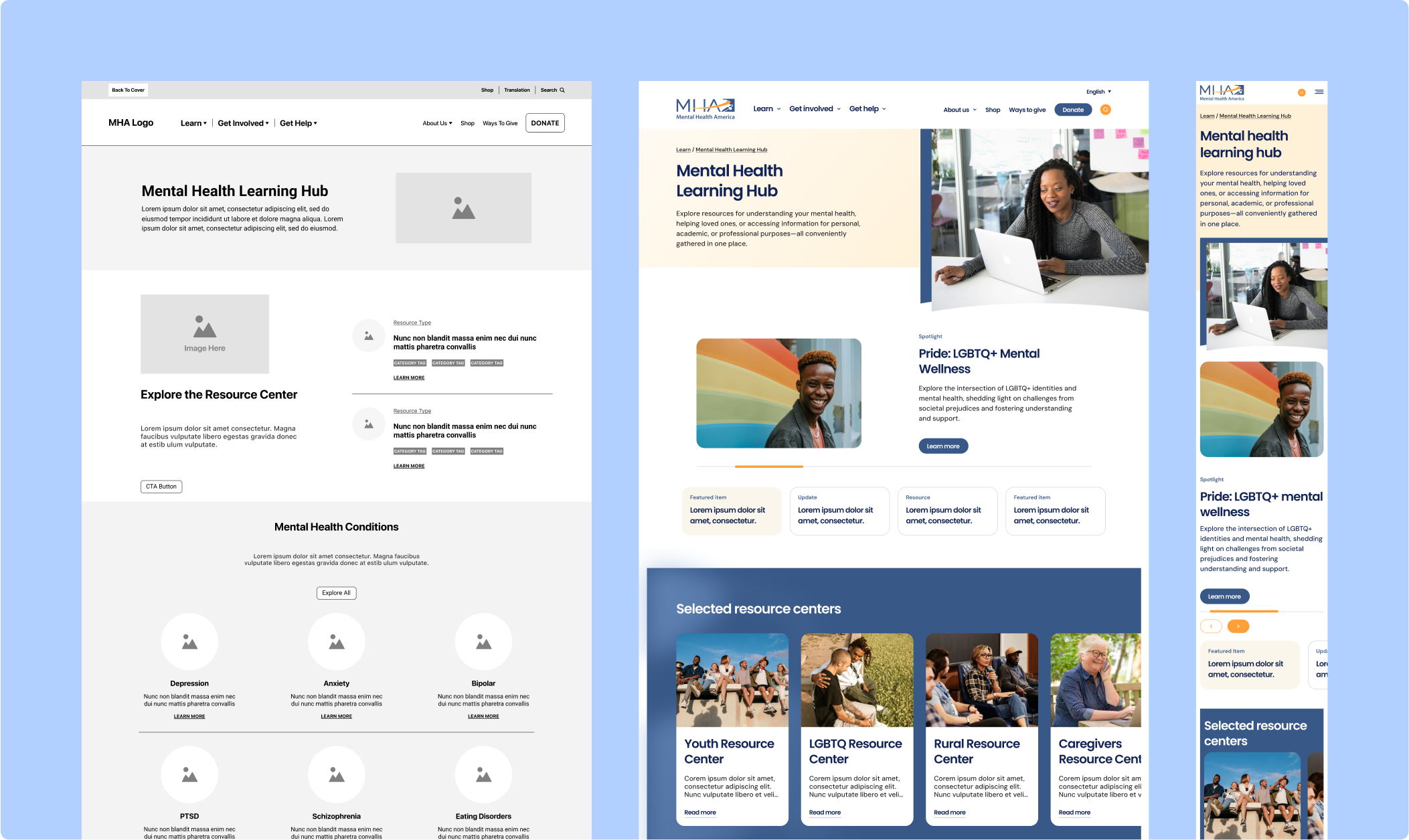 With the team at Great Believer, I led the visual and UX design for the Mental Health America website redesign, serving as the sole designer on the project. Collaborating closely with MHA’s internal team, I helped translate complex content needs into a more intuitive, accessible, and emotionally resonant user experience for the nation’s oldest mental health nonprofit. Working alongside developers and project managers, I crafted a design system that balanced MHA’s legacy brand with a more modern, web-friendly aesthetic. The result is a streamlined, user-centered site that better supports the needs of those seeking mental health resources.